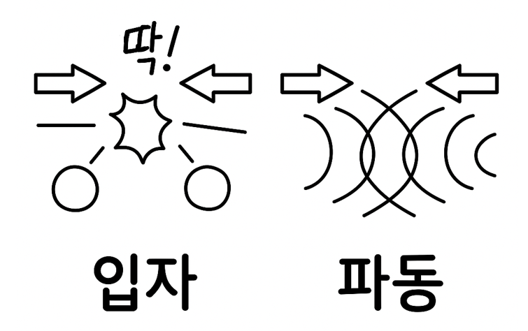 - 입자(돌멩이, 당구공) : 벽에 던지면 '딱!' 하고 한 점에 꽂힘. 입자끼리 부딪히면 튕겨 나감.