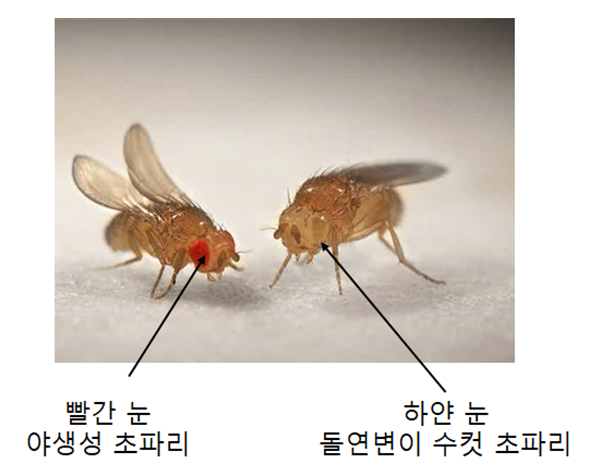 그런데 이건 다 헛수고였고,, 위대한 발견은 자연적으로 발생한 돌연변이 초파리로부터 였습니다!!!!! 위에 있는 초파리 사진을 보세요.