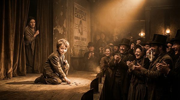 어느 날 엄마 목소리가 안 나와서 무대에 못 서게 되자 5살짜리 채플린이 대타로 올라가서 노래를 불렀어.