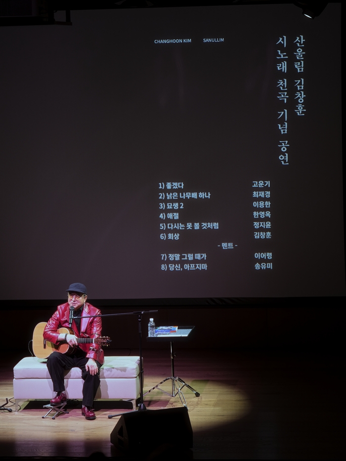 공연 ‘필경, 환대가 될 것이다’는 11월15일 서울 강남 거암아트홀에서 열렸습니다.  작곡가, 화가, 그리고 스스로 “시를 노래하는 사람”이라 부르는 ‘종합예술인’ 김창훈이 시노래 1000곡 완성을 기념하는 첫 솔로 콘서트였습니다. 무대는 심플했지만, 그의 기타와 노래, 그리고 시노래 25편이 극장을 빈틈없이 채웠습니다. 시인 25명의 언어가 대형 스크린을 통해 투사됐고, 동시에 김창훈의 목소리로 다시 태어났습니다.