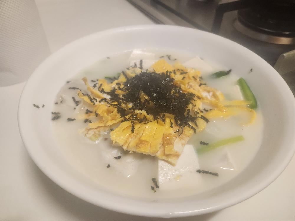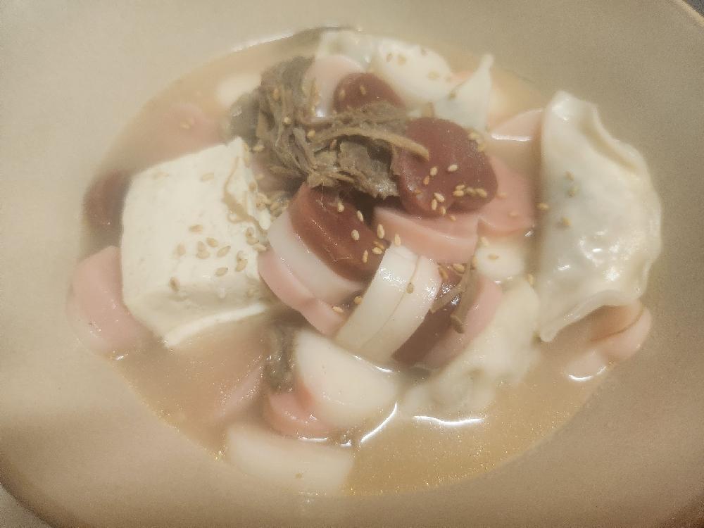 떡200g 호박1/5 기름최소화지단 계란1개분 고향만두3개 두부150g 무첨가김살짝 사골국물