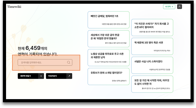 검색바는 초기화면 좌측중단, 연혁화면과 타임라운지 화면 우측 상단에 있습니다.