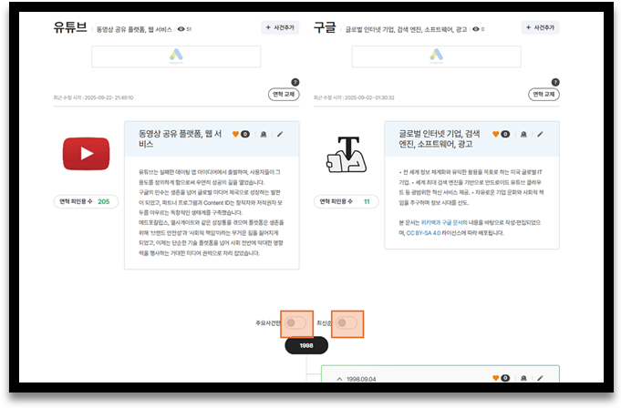 두 가지 연혁을 시간 순으로 비교하며 열람할 수 있습니다.