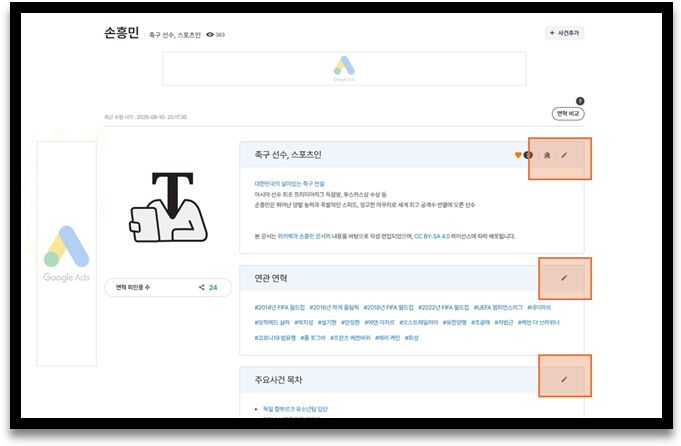 연혁 우측에 수정하기 아이콘을 눌러