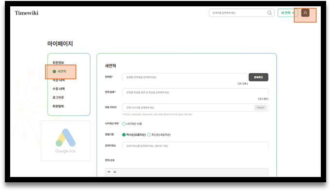 화면 우측 상단 마이페이지 아이콘 → 좌측 ‘새연혁’ 탭에서 새 연혁을 개설할 수 있습니다.