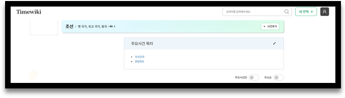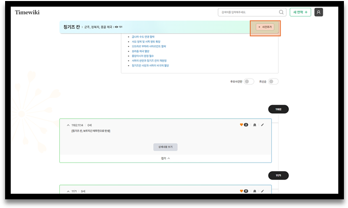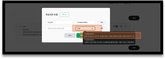 ▲ 연혁명, 연혁분류의 우측 끝에 있는 ‘+사건추가’ 버튼을 통해 현재 열람 중인 연혁의 사건을 추가할 수 있습니다.