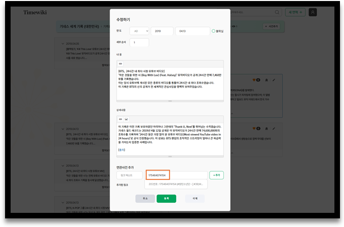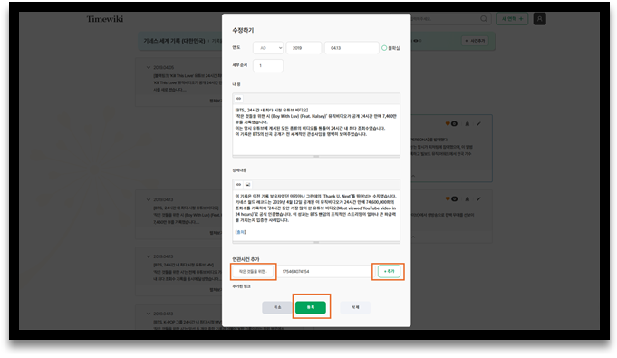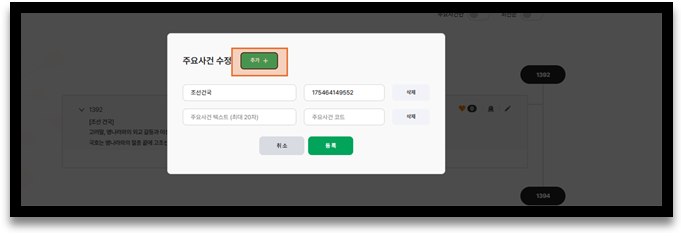 ⑤ 상단에 ‘추가’버튼을 클릭하여 다른 주요사건을 추가할 수 있습니다.