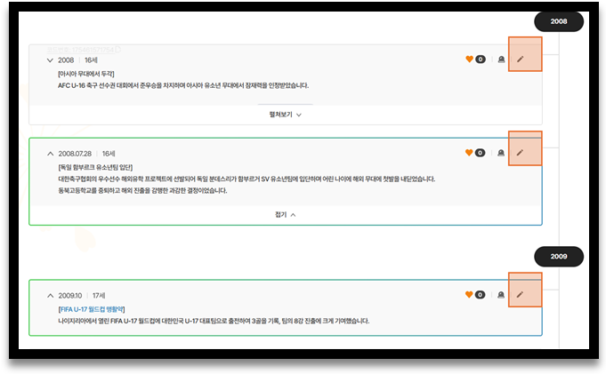 해당연혁에 포함된 모든 사건들에 자동으로 만나이가 계산되어 표기됩니다.